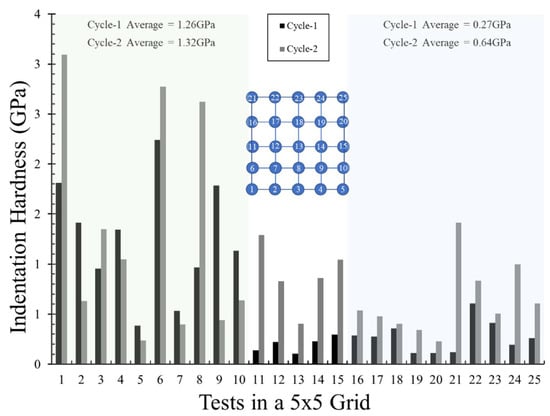 - Based on the resultant coefficient of variation from cycle 1 of the indentation tests, it was revealed that the porous microstructure of the PP block influenced more pronouncedly the hardness values compared with the modulus values (i.e., hardness exhibited a much higher coefficient of variation in cycle 1 compared with modulus). However, better conformity of the hardness values was shown in cycle 2 with significantly reduced coefficient of variation values;