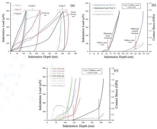 - Major observed modes of behavior of the unloading phase could be classified as (i) elbowing (gradual or sharp change in the unloading slope), and (ii) bowing out (negative elastic stiffness in the initial stage of unloading) and they are related with the relaxation of the material upon unloading. Additionally, significant increases in pop-in events in the loading phase and elbowing events in the unloading phase of cycle 2 tests reconfirmed the densifications of the indent zones during cycle 1 test;