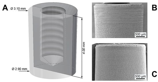 Thirty-six male adult Wistar rats with an average mean body weight of 578.4 g ± 55.6 g were included in the study. The animals were kept at the laboratory with dry food and water ad libitum under standard conditions, including an artificial light–dark cycle of 12 h. All performed surgical interventions were made under general anesthesia with isoflurane (Forene®, AbbVie Germany GmbH and Co. KG, Ludwigshafen, Germany) and intramuscular analgesia via 0.5 mg carprofenum (Rimadyl®, Zoetis Germany GmbH, Berlin, Germany). Following anesthesia, the lateral epicondylus of the femur was exposed via longitudinal incisions at the lateral aspect of the femur. After drilling the implant hole (diameter 3.0 mm, Figure 2) using a sodium chloride cooled implant burr (pilot drill bur G1001 RAXL, Hager and Meisinger GmbH, Neuss, Germany), the implants—randomly chosen by using a computer-generated list—were inserted. In each animal, one implant was inserted on each side, resulting in a total of seventy-two implants (SPI: n = 36; PI: n = 36). After closing periosteum, muscle and skin in layers using absorbable suture material (Vicryl®, Ethicon, Norderstedt, Germany), the animals received intramuscular analgesia via 0.5 mg carprofenum (Rimadyl®, Zoetis Germany GmbH, Berlin, Germany). Additionally, metamizol natrium (Novaminsulfon-ratiopharm®, ratio-pharm GmbH, Ulm, Germany) was applied in the drinking water on a daily basis for the first 5 days postoperatively.
