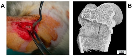 (A) Intraoperative picture of inserted implant in lateral aspect of femur. (B) µCT image of the bony defect in lateral femur condyle with SiO2/HA-coated PEEK implant (SPI), 4 weeks postoperative. The PEEK implant is radiolucent and thus not visible.