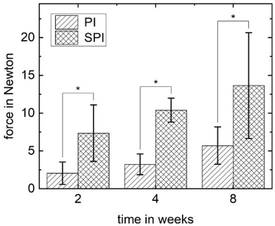 The conducted pull-out tests ran smoothly without any complications. Analyses of the mean applied forces revealed an increase over time in both groups PI and SPI. The mean applied pull-out forces in SPI were about twice as high in PI at each point in time (2 weeks: 7.3 ± 3.7 versus 2.1 ± 1.5 N; 4 weeks: 10.4 ± 1.6 versus 3.2 ± 1.4 N; 8 weeks: 13.6 ± 7.0 versus 5.7 ± 2.5 N) and significantly increased compared to the PI at the same time points (p < 0.01). The results of the pull-out test are illustrated in Figure 4.