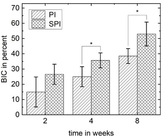 Bone to implant contact (BIC) of the PI and SPI group with standard deviation. The mean BIC of both groups increases as a function of time. After 4 and 8 weeks, the BIC is significantly higher for SPI (* p < 0.05).