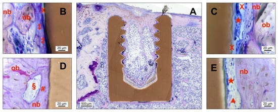 Images of undecalcified cut and ground sections of the PI and SPI group after different time points postoperatively. The sections were histologically stained with a mixture of Giemsa and toluidine blue. (A) Overview image of an uncoated pure PEEK implant (PI) after 8 weeks showing new bone formation around the implant outline. (B–E) Additional detail images with higher magnification focusing on the direct bone-implant contact area for SPI (2 weeks (B) and 8 weeks (D)) and PI (2 weeks (C) and 8 weeks (E)). Note: nb—new bone, ob—old bone, X—preparation artifact, ★—elongated irregular-shaped giant cell, ‡—osteoid, #—osteocyte in contact to the implant surface, §—blood vessel, ▲—fibroblast.