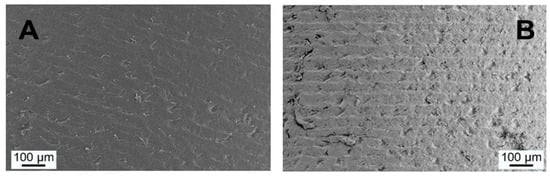 SEM images of the unmodified implant surface (PI) (A) post-production and (B) after 8 weeks in vivo. Almost no tissue remains on the surface after pull-out test.