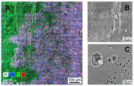 (A) EDX mapping of the implant surface (SPI) 8 weeks postoperative. The positions of the elements calcium, carbon and phosphor are indicated in blue, green and red, respectively. Areas covered with soft tissue are correlated with carbon. The residual surface shows higher concentration of calcium and phosphor. (B) Higher magnification of a surface portion with fibrous soft tissue coverage. (C) Smooth extracellular matrix covering areas with Ca and P occurrence—irregularities in this matrix exhibit an underlying nanostructure.