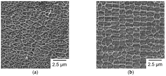 The solidification of the melt pools in SLM fabricated martensitic stainless steel was along the direction having the largest temperature gradient, usually from the boundary to the center of the melt pool. Therefore, during initial solidification of a melt pool, austenite heterogeneously nucleates at the boundary and then grows toward the center to form an austenite-phase melt pool [31]. After cooling below the Ms temperature, the prior austenite phase transforms to martensite during the rapid cooling stage. As a result, elongated cellular structures are outlined by the prior austenite grain boundaries, and the martensite laths are embedded in the sub-grain structures, as shown in Figure 10. Figure 10 shows the high-magnification SEM micrographs of the elongated cellular structure within the melt pool, for each given group. As shown in Figure 10, only the retained austenite is clearly observed in the cellular structures, but the martensite laths within the cells are barely seen. The reason is that the very fine lath structure of martensite is sensitive to etching, such that it is barely seen in the etched sample. It was found that the sub-grain size is highly related to the size of laser spot (Figure 10). An increase in melt pool width and a decrease in melt pool depth for a larger laser spot size will slow down the cooling rate of the material to produce a coarser final microstructure. In addition, as the laser spot size increases, the re-heated zone also increases. Accordingly, the sub-grains of S3 and S4 are relatively elongated (Figure 10c,d), in comparison to S1 and S2 (Figure 10a,b), as they have more time to grow along the direction of solidification. For Group S4, the laser spot size is 0.4 mm, and the width of melt pool is 0.2 mm. Therefore, it has a larger re-heated zone compared to other groups. Due to the reheating of the subsequent laser beam, grains in the re-heated zone have a longer time to grow to a larger size. Consequently, a coarser microstructure is responsible for the lower mechanical strength of Group S4.