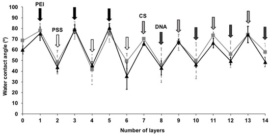 Water contact angles of (PEI-PSS)3 followed by (CS-DNA)4 multilayer films on PMMA (grey line) and Ti (black line) surfaces. The error bars represent the standard deviation over three replicate surfaces and three measurements per surface.
