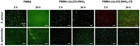 Representative fluorescence microscope images of adherent S. aureus ATCC 12598 and S. epidermidis ATCC 35984 on PMMA, PMMA-LbL(CS-DNA)4, and PMMA-LbL(CS-DNA)4-CS surfaces after incubation at 37 °C for 2 h and 24 h, respectively. Bacteria were stained using vitality staining solution (3.34 mM SYTO 9 and 20 mM propidium iodide in PBS) and were incubated for 15 min in the dark at room temperature. The scale bar denotes 25 µm.