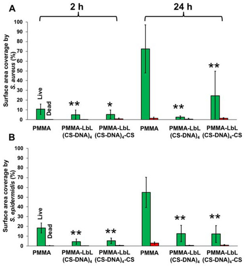 Surface coverage of adherent live (green bars) and dead (red bars) bacteria. (A) S. aureus ATCC 12598 and (B) S. epidermidis ATCC 35984 on uncoated and multilayer-coated PMMA surfaces after incubation at 37 °C for 2 h and 24 h. PMMA-LbL(CS-DNA)4 has a DNA top layer, and PMMA-LbL(CS-DNA)4-CS has a CS top layer. The error bars represent the standard deviation over three biological replicates. ANOVA tests were performed, followed by a Tukey’s HSD post hoc test, and a p-value < 0.05 was considered significant. ** denotes significance (p < 0.01) compared to uncoated PMMA, and * denotes significance (p < 0.05) compared to uncoated PMMA.