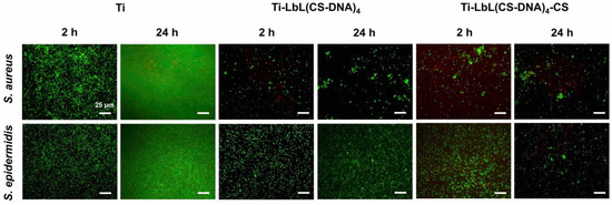 CS-DNA multilayer-coated PMMA and Ti plates were placed in sterile tissue culture polystyrene (TCPS, Agilent Technologies, Vienna, Austria) well plates. Each well was filled with 4 mL bacterial suspension and was cultured at 37 °C for 24 h. At 2 h and 24 h, the bacterial suspension was removed, and the wells were washed with PBS to remove unbound bacteria. Subsequently, vitality staining solution (3.34 mM SYTO 9 and 20 mM propidium iodide, Invitrogen, Thermo Fischer Scientific, Austria) in PBS was added to the wells and was incubated for 15 min in the dark at room temperature. The surfaces were then rinsed with PBS to remove the unbound staining, followed by observation using fluorescence microscopy (Nikon Eclipse TE2000, Nikon Europe B.V., Vienna, Austria) to characterize the viability of the adherent bacteria on the coated plates. Live bacteria with intact cell membranes emit green, whereas dead bacteria with damaged membranes emit red. The uncoated PMMA and Ti plates were used as control.
