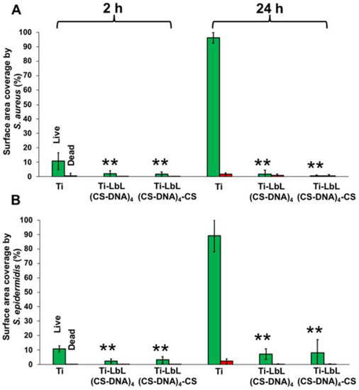Surface coverage of adherent live (green bars) and dead (red bars) bacteria. (A) S. aureus ATCC 12598 and (B) S. epidermidis ATCC 35984 on uncoated and multilayer-coated Ti surfaces after incubation at 37 °C for 2 h and 24 h. Ti-LbL(CS-DNA)4 has a DNA top layer, and Ti-LbL(CS-DNA)4-CS has a CS top layer. The error bars represent the standard deviation over three biological replicates. ANOVA tests were performed followed by a Tukey’s HSD post hoc test, and a p-value < 0.05 was considered significant. ** denotes significance (p < 0.01) compared to uncoated Ti.