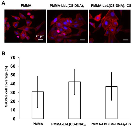 (A) Fluorescence microscopic images of SaOS-2 cells after 48 h growth on PMMA, PMMA-LbL(CS-DNA)4, and PMMA-LbL(CS-DNA)4-CS surfaces. SaOS-2 cells were stained with PBS containing DAPI and TRITC-phalloidin. The scale bar denotes 25 µm. (B) Surface coverage by SaOS-2 cells after 48 h of growth on uncoated and multilayer-coated PMMA surfaces. The error bars represent the standard deviation over three replicate samples and six images per sample with separately cultured SaOS-2 cells. ANOVA tests were performed, and no significant differences were observed between surfaces.