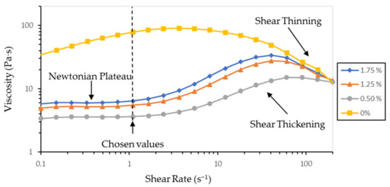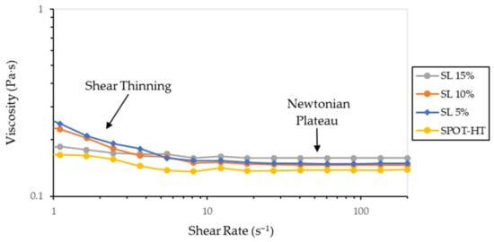 Viscosity of the samples were performed in a stress-controlled rheometer (Haake Mars III, Thermo Fisher, Waltham, MA, USA) at 25 °C. A 35 mm plate-plate geometry was used with 0.5 mm gap. Viscosity curves were obtained from 0.1 to 200 s−1 of shear rate, in logarithmic increase, in CSR mode.