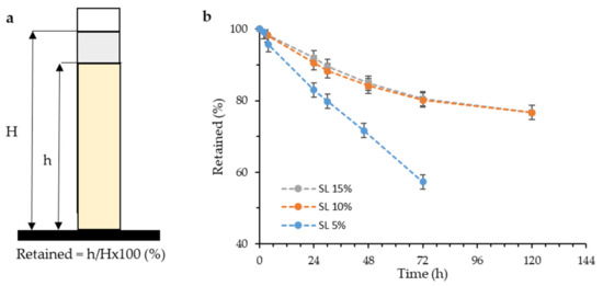 Once the resin was formulated, the stability of the suspension was verified by means of sedimentation tests of the particles. A stable suspension is required to achieve a homogeneous impression with constant properties throughout the printed part. As the suspension is allowed to stand, the particles tend to settle due to their very high density and the low viscosity of the suspending medium. To measure the sedimentation rate, the percentage of retained material was calculated as can be seen in Figure 7a, where H is the height of the total resin and h is the height of the resin where there is still the initial particle concentration. The values of material retained as a function of time are shown in Figure 7b for each of the reinforced resins.