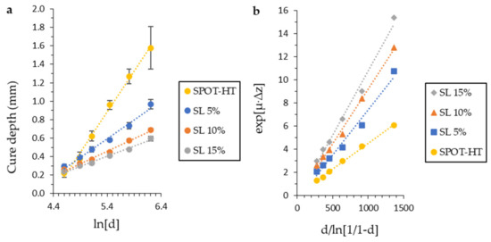 The reactivity of the reinforced resins was characterized as established. From the cure depth data related to the exposure energy dose, the model parameters were calculated according to the Equation (1) and the plot of the graphs in Figure 8a,b. Each point for an energy concentration and dose has been determined by a minimum of five tests. The specific values for each determined constant of the model of Equation (1) can be seen in Table 2.