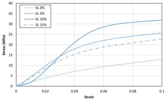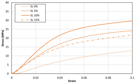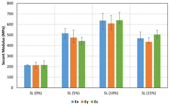A material behaviour with no clear Hookean region has been found for all samples. Therefore, a secant modulus (0.6% of longitudinal strain after toe region compensation) for each specimen has been calculated. The results are shown in Table 3, Table 4 and Table 5 for X, Y and Z samples, respectively. Furthermore, the mean values for each case are compared in Figure 9. The results show an increment of secant modulus after the addition of fillers in the base photocurable material. Furthermore, the enhancement of mechanical properties is not lineal nor constant to the increment of solid load content. In fact, the maximum values are achieved for a solid load content of 10%, whereas lower mechanical properties are obtained for a higher solid load content (15%). In addition, the stress-strain curves for all samples with a solid load content of 0% and 10% are compared in Figure 10. Consequently, an optimal solid load content can be found to increase mechanical properties.