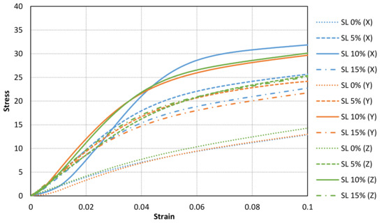 Figure 11, Figure 12 and Figure 13 shows the stress-strain curves for a representative compression sample for each printing orientation (X, Y and Z). It can be observed the enhancement of mechanical properties after the addition of reinforcement fillers. In addition, the stress-strain curves for each orientation specimens and solid load content are compared in Figure 14. Similar stress-strain relationships are obtained for each orientation for the same solid load content. In fact, the results do not present a significantly difference between stress-strain curves of each orientation (Figure 10 and Figure 14). Consequently, it seems reasonable to consider an isotropic material behaviour on MIP-SL printed parts if a full conversion ratio is achieved during the printing process. This assumption can also be done after a post-curing process [17]. Thus, achieving a uniform conversion ratio on the printed part domain is a key factor to achieve an isotropic material behaviour.