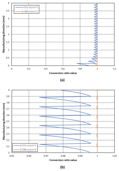 The comparison of conversion ratio distribution along the manufacturing direction between each case can be seen in Figure 15. The results show that a practically full and uniform conversion (Φ > 0.995) is achieved with an energy exposure dose of 580 mJ/cm2, whereas a clearly non-uniform distribution is obtained with an exposure dose of 252 mJ/cm2. This effect is more notorious in the last printed layers. Therefore, the energy exposure dose needs to be calculated according to the layer thickness and material parameters in order to achieve a higher and more uniform conversion ratio distribution.