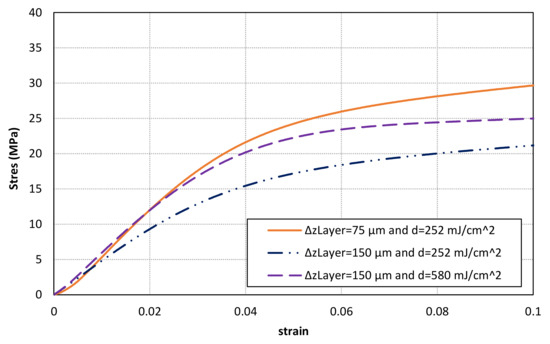 The results of compression tests can be found in Table 6 and Figure 16. A similar secant modulus is obtained for samples with layer thickness of 75 μm and 150 μm after adjusting the energy exposure dose. On the contrary, lower values are achieved for samples with thicker layers and non-optimized energy exposure dose. Thus, a properly definition of printing parameters is a key factor to increase the conversion ratio value and, consequently, to enhance mechanical properties. However, the stress-strain curves of samples with thicker layers seem to have lower stress values after the initial part although similar secant modulus have been obtained. Finally, it can also be observed that a clearly lower stress-strain relationship is found for samples without a full conversion distribution. Thus, it is recommended to analyse and optimize the printing parameters in order to achieve a full conversion distribution and, consequently, to enhance stress-strain material behaviour.