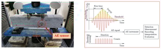 In this study, a twelve-channel SAEU2S data acquisition system from the Soundwel Technology Corporation was used. A sensor with a frequency range of 22–220 kHz and resonant frequency of 150 kHz was firmly attached to the side of each sample by a coupling agent, and the AE signal was collected during the four-point bending test. The threshold value of the AE acquisition system was set to 45 dB, and the acquisition frequency was set to 5 msps. The AE parameters including impact number, amplitude, ringing count, rise time, duration and energy were collected. AE testing arrangement for UHPC notched beams under four-point bending is illustrated in Figure 1.
