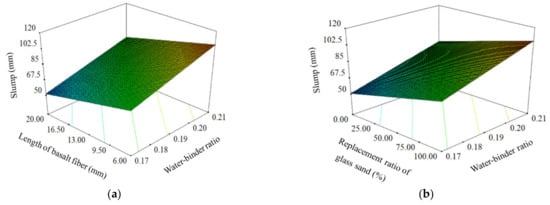 3D response surface plots between preparation parameters and slump: (a) Length of basalt fiber and water-binder ratio; (b) replacement ratio of glass sand and water-binder ratio.