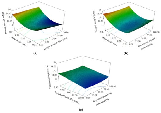 3D response surface plots between preparation parameters and flexural strength: (a) Water-binder ratio and length of basalt fiber; (b) water-binder ratio and replacement ratio of glass sand; (c) length of basalt fiber and replacement ratio of glass sand.