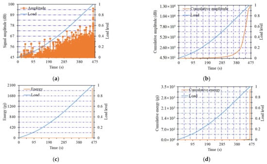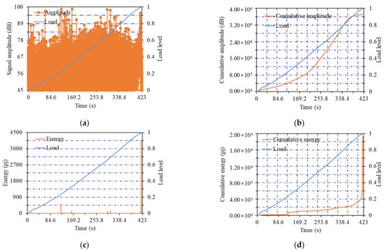 In Figure 4b, it is presented that the first stage of the cumulative amplitude curve was from the beginning of loading to the 0.5 load level, the curve was very gentle and the amplitude growth was not obvious. At this stage, the dense internal structure was very effective to resist the load. The increase of the curve slope started from the 0.5 load level, at this time, it entered the second stage, the number of amplitude values started to increase at a slower speed. It can be seen that the internal fractures began to exhibit obvious generation and development. When the load reached the 0.8 level, the cumulative amplitude curve entered the third stage and the slope of the curve increased obviously, which meant that the amplitude entered the high growth stage until the failure load reached. A large number of internal cracks began to develop and penetrate, resulting in the rapid emergence of amplitude value.