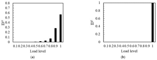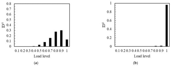 The corresponding to the flexural strength of the notched beam specimen with the middle value of 12.83 MPa is shown in Figure 8a. From 0.1 to 0.3 load level, the value of was very small and almost invisible, which meant that the relative impact number was small at this stage. increased from 0.4 load level, the impact number started to increase continuously from 0.4 to 0.9 load level at this stage. reached the maximum at 0.9 load level. It was worth noting that the load that can be effectively resisted was lower and the apparent time of the number of impacts was earlier when the strength of the notched beam decreased. When the load exceeded 0.9 level, the value of decreased rapidly in the last load level. It meant that the impact number decreased significantly in 1.0 load level. This can correspond to the previous cumulative amplitude curve, the slowing of the cumulative curve meant the decrease of the effective signal number, which in fact means the decrease of the impact number. That was to say, the development of a large number of cracks has been carried out before the final load level. As shown in Figure 8b, the very small value of occurred at 0.8 and 0.9 load levels, and most of the energy was generated at the 1.0 load level. This was essentially the same as the energy curve and the cumulative energy curve. This showed that, although the number of cracks that developed in the final load was relatively small, the extremely high energy was released during the penetration of these cracks.