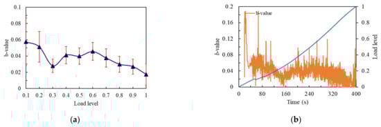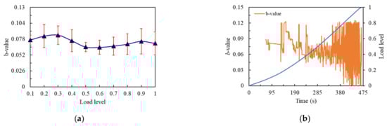 b-value curves of the No.14 notched beam: (a) b-value changes curve with load level; (b) b-value changes curve with time.
