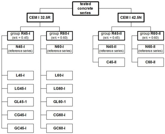 The aggregate after the impregnation and drying was stored for two weeks before the concrete was made, except for the C series, where this time was reduced to 1 week. In each group of series listed in Table 1, one reference mixture was made. Aggregate for these mixtures was not impregnated but was rinsed with tap water according to the same procedure as for impregnation. In this way, the possible influence on the results of rinsing the dust fractions from the aggregate during the impregnation process was eliminated. The reference series were marked with N. Because the research plan is quite ramified, so in Figure 1 its scheme is presented.