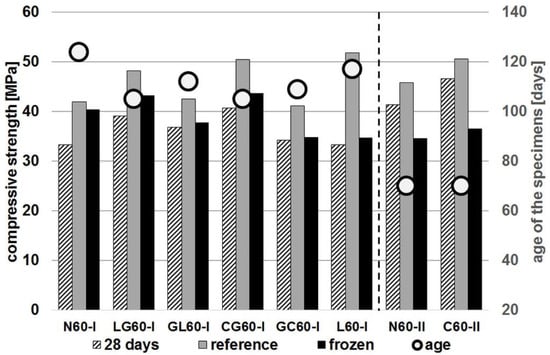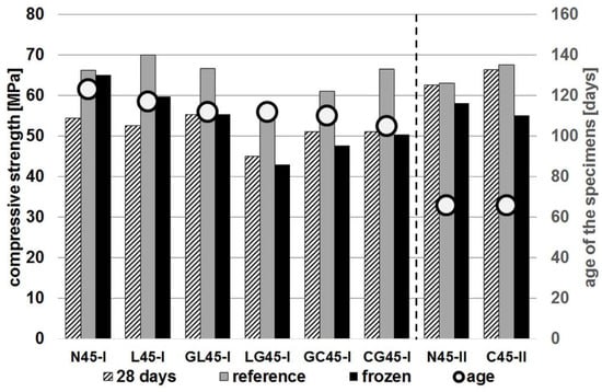 The results of the frost resistance test are shown in Figure 2 and Figure 3. They compare the compressive strength values obtained after 28 days with the strength values of specimens subjected to freeze/thaw cycles and those not subjected to such cycles serving as a reference. The age of the specimens at the time of the test is also given. In order to facilitate the analysis of the obtained results the concrete series in both drawings are arranged according to the increasing decrease of strength caused by subjecting the material to freeze/thaw cycles. The exception are the concrete series from groups R45-II and R60-II, which are grouped on the right side of each diagram.