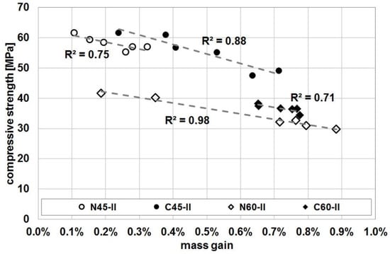 The obtained relationships between the increase in weight of a single specimen and the obtained value of its strength are shown in Figure 4. They were limited to the results obtained for the N45-II, N60-II, C45-II and C60-II series, because in these cases relationships were based on six results (not four, as in the case of the other series) and thus the obtained R2 values are more reliable. It should be noted, however, that the same type of a relationship was recorded for almost all tested series, and the obtained values of R2 ranged from 0.79 to 0.98 (significantly higher for a series of concrete with the index w/c = 0.45). Only for series N45-I and N60-I and L60-I such correlation could not be found. In the latter case, the opposite relation was obtained, but it was determined by one result significantly different from the others.