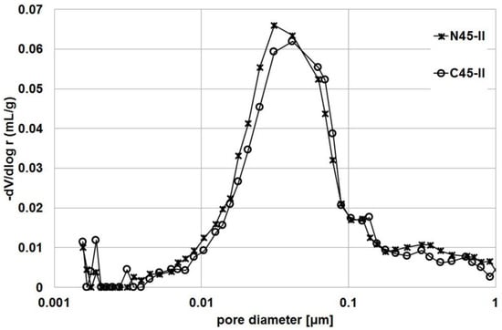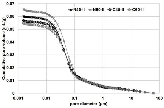 These results are confirmed by the cumulative pore volume plots in Figure 5, which show clear differences between the series with impregnated and untreated aggregate. A clear decrease in pore volume begins in the 0.1–1 μm diameter range. Figure 6 and Figure 7 compare the pore structure in samples of the R45-II series (Figure 6) and the R60-II series (Figure 6). In order to better illustrate the differences, they were limited to pores with a diameter of less than 1 μm.