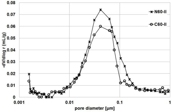 Pore size distribution was determined by means of mercury intrusion porosimetry (MIP) for series N45-II, N60-II, C45-II I C60-II. The method is based on intrusion of mercury, which is non wetting liquid, to pores of studied sample. The penetrated pore’s diameter is inversely proportional to applied pressure (Washburn equation). The applied pressure is automatically increasing during the experiment and thus mercury penetrates narrower pores. The experiment was carried out by using Pascal 140 and 440 devices (Thermo, Waltham, MA, USA). Pore size distribution has crucial impact on the permeability and thus durability of porous composites [48,49].