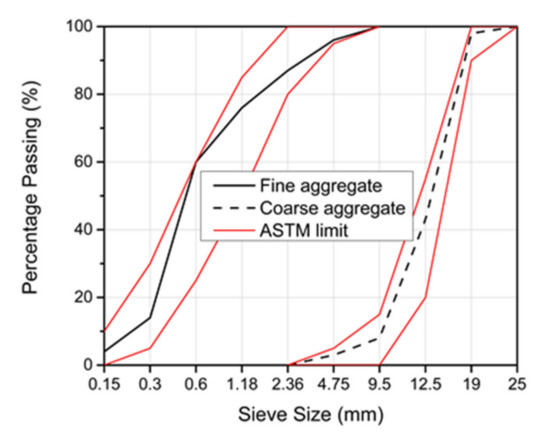 - ASTM C33/C33M-18. Standard Specification for Concrete Aggregates; ASTM International: West Conshohocken, PA, USA, 2018. [Google Scholar]