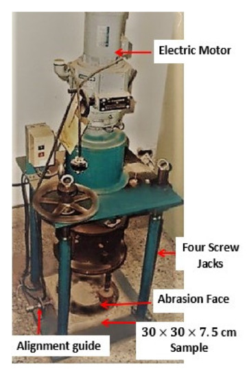 The abrasion resistance of the RC surface was investigated using the standard test method according to [34]. The abrasion tests were performed using the Revolving disk abrasion test machine. In this method, friction forces were applied by rotating steel disks to grind and rub the concrete samples (see Figure 4). Height measurements of the specimens were taken throughout the test. The test period was 60 min so as to produce significant wear on the concrete faces.