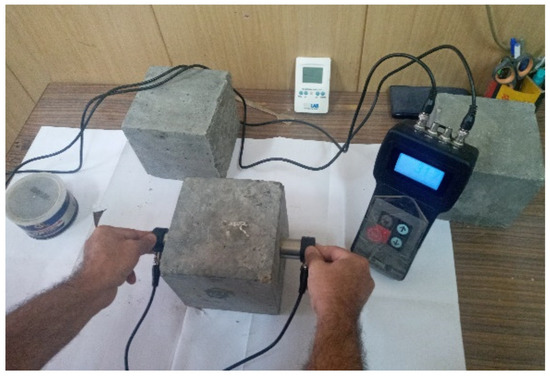 Non-destructive testing of specimens at the age of 28-days was performed by passing an electronic wave through the concrete specimens according to [35]. Ultrasound pulse velocity (UPV) tests were conducted on the RC cubes (150 mm × 150 mm × 150 mm). Two 50 mm transducers rods were used in this method and positioned so that they were aligned at the same level opposite to each other (see Figure 5). The transducer properties were as follows: oscillation frequency of 54 kHz and transit time accuracy of ±1%. The results of the transmission times were measured and the ultrasonic wave velocity in concrete was obtained by dividing the transmission distance (150 mm) by the measured time. After that, the concrete cubes were tested under compression.