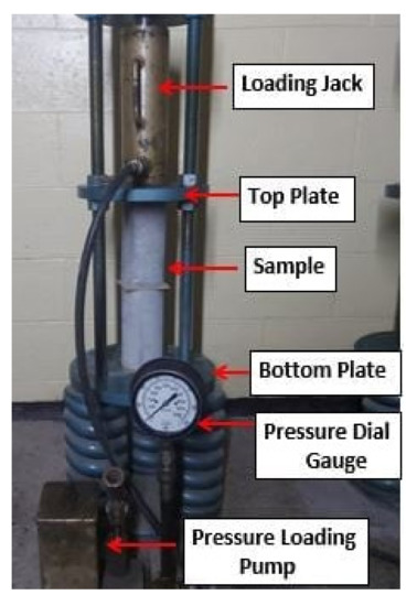 The RC specimens were exposed to sustained axial compressive loads to determine the effect of creep according to [36]. RC cylinders of 100 mm × 200 mm were used to investigate the effect of creep. The creep loading frame, as shown in Figure 6, was used to apply the sustained compressive load. The applied load was 40% of the compressive strength of the specimens. The compressive strain was measured using a dial gauge with an accuracy of 0.002 mm. This test was carried out at a conditional temperature of (21 ± 5 °C) and relative humidity of (35 ± 5%). The strain readings were taken after loading and then each week for the rest of the test. The load was modified periodically to avoid concrete relaxing strain. Finally, the load was released, and readings were taken accordingly.