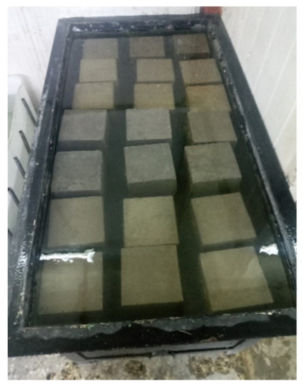 The RCA influence on the RC density was examined according to [37]. Concrete cubes of 150 mm × 150 mm × 150 mm were poured and set for 24 h and then cured for a further 6 days underwater (see Figure 7). The density was determined as follows: 1—the specimens were weighed in air; 2—the specimens were weighed again underwater; 3—the difference in weights was the weight of water displaced; 4—the density was the weight in air divided by the weight of water displaced.