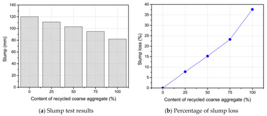 The workability of the fresh RC was examined using the slump flow test according to ASTM C143 [38]. Figure 8a demonstrates the results of the slump tests. The slump of the RC was lower than that of the CC mix. Inversely proportional relationships were found between the replacement content of the RCA and the slump test result. This low workability of RC is due to the hindrance in the movement of concrete particles by RCA particles. The higher surface area and water absorption of the RCA increased the need for water, which led to reductions in workability. The comparative analysis of slump has been performed using the percentage slump loss factor (Equation (1)).