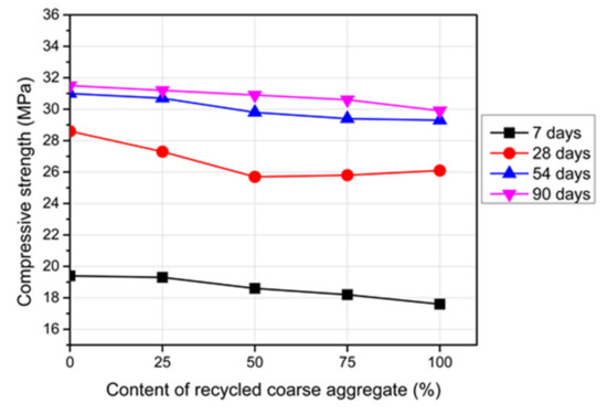 The average compressive strength of the RC with various RCA contents is exhibited in Figure 9. The presented data are the average results of three concrete cylinders tested for each group at a certain age with a standard deviation range of 2.79% to 3.15%. The compressive strength was reduced in comparison to the reference concrete. More reductions in the compressive strength of the RC were obtained as the RCA replacements increased. These reductions were in the range of 5.0–9.3%. The existence of a weaker interfacial transition zone (ITZ) between the RCA and mortar, which is considered as the strength-limiting phase in concrete [41], was the main cause of these reductions in the compressive strength. The high water absorption of the RCA, which was gathered at the aggregate surface and resulted in more pores in the ITZ, contributed to form a weaker ITZ relative to the case of using NCA [42,43]. In addition, the low strength of the RCA relative to the NCA was another cause of the lower strength of the RC [44].