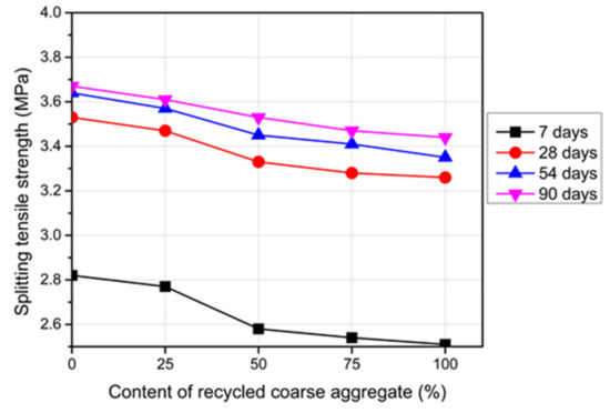 Figure 10 clarifies the experimental results of the splitting tensile strength of the reference concrete and RC at different ages. Using the RCA caused reductions in the splitting tensile strength. The higher content of RCA used, the lesser the tensile strength obtained. For 100% replacement with RCA, a 10.7% difference in the tensile strength was observed between the reference concrete and the RC at an age of 7 days. Whereas this reduction decreased to 8.3% for the age of 28 days and over. The residual cement mortar in the RCA provided weakened points, which caused reductions in the tensile strength of the RC. Previous studies confirmed 11–17% reductions in the splitting tensile strength due to 100% replacement of the RCA [39,47]. Moreover, the composition and the source of the RCA contributed significantly to these reductions.