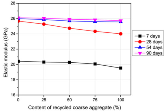 The presented data are the average results of three concrete cylinders tested for each group at a certain age with a standard deviation range of 1.50% to 2.15%. The RC showed a lower elastic modulus relative to the reference concrete, as presented in Figure 11. The difference in the elastic modulus between the RC and the reference concrete was 7.7% for a 100% RCA content after curing for 28 days; the reduction in the elastic modulus became higher when the percentage of the RCA increased. The relative lower stiffness as well as the higher porosity of the RCA were the main reasons for this reduction.