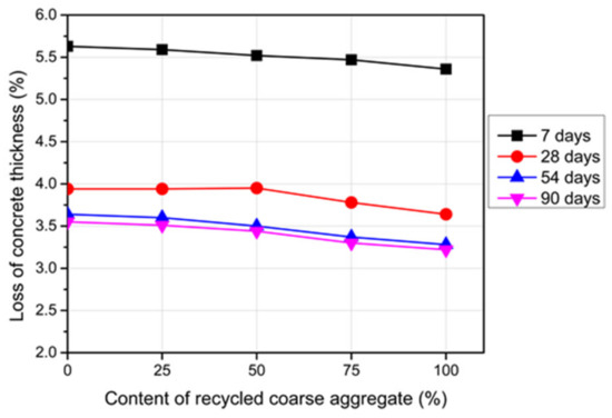 Mechanical degradation of concrete due to vehicular movement or pedestrian traffic causes loss of concrete mass, which is defined as abrasion. Figure 12 shows the results of the abrasion resistance of the RC and reference concrete in terms of the concrete thickness loss at different ages. The results confirm that the abrasion wear rate of the RC was lower relative to the reference concrete. This means that a higher abrasive wear resistance was obtained and this resistance was enhanced as the RCA content increased. This phenomenon could be attributed to the roughness of the RCA due to the long-adhered cement paste. The formed good bond between the new paste and the mortar of the RCA improved the abrasion resistance of the RC [48]. Moreover, the type of RCA could affect this resistance [44].
