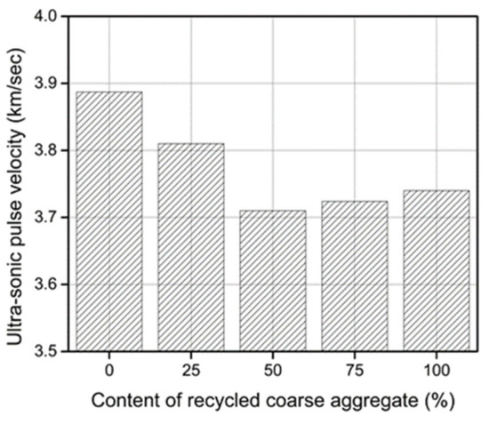 Ultra-sonic pulse velocity of concrete with various contents of the recycled aggregate at the age of 28 days.