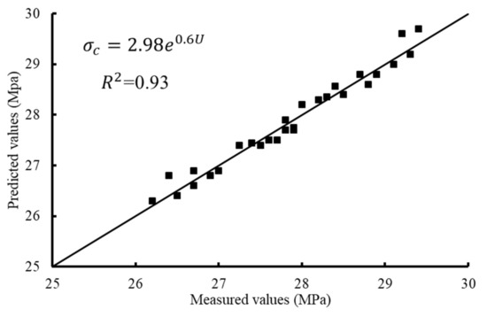 where σc is the compressive strength at the age of 28 days in MPa and U is the UPV (km/s100). The validation process to assess the adequacy of the proposed prediction model and measure the error or accuracy of the prediction is exhibited in Figure 14.
