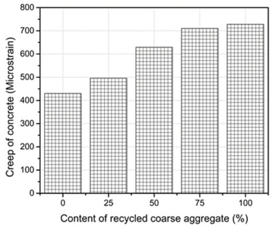 - For 100% replacement of the RCA, the creep strain increased by 67.5% relative to the reference concrete. However, only a 16% increase was obtained for the case of 25% replacement. The higher volume of cement paste in the RC compared to that of the reference concrete caused higher losses of the physically absorbed water under the sustained stresses and, subsequently, led to this increase in the creep strains.