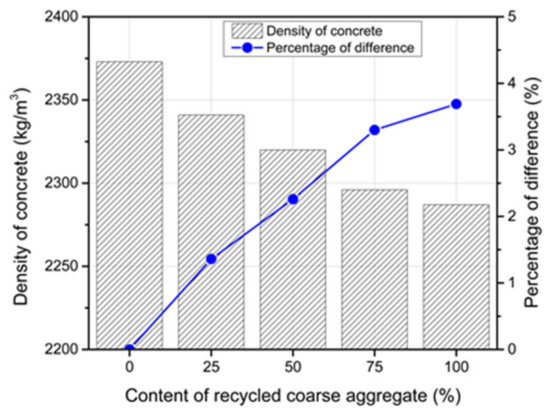 The lower unit weight of the RCA relative to the NCA led to reductions in the RC density and these reductions increased as the RCA content increased (see Figure 16). For the RCA content of 100%, a reduction of 3.9% was obtained. This reduction was reported as 3.3% by Etxeberria et al. [52] and 5% by Verian [53] for the same RCA content. The adhered mortar in the RCA was lightweight compared to the NCA of the same volume, which caused the decrease in density [54].
