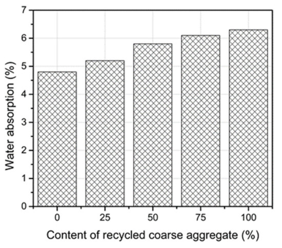 Water absorption of concrete can be an indirect indication of concrete durability. Absorbed water carries aggressive ions such as sulfate, chloride, and hydrogen ions into concrete, which cause reactions with the cement paste and affect the concrete durability. Figure 17 presents the variation in the water absorption of the RC with various contents of the RCA. Due to greater water absorption of the RCA compared to the NCA (see Table 4), using the RCA increased the water absorption of the RC. A linear relationship was observed between the water absorption and the content of the RCA. For 100% replacement of the RCA, the water absorption increased by approximately 7%. Previous studies confirmed the same increase in water absorption [2,9]. The increase in the water absorption of the RC is a problem for the industry because the more water absorbed into the concrete, the easier movement of ions from external exposure into concrete is. Consequently, the corrosion resistance of the reinforced RC is affected.
