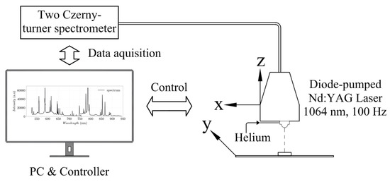 LIBS’ main experimental instruments include lasers, spectrometers, detectors, and computers, as shown in Figure 1. The LIBS experimental setup used in this study consist of a diode-pumped Nd:YAG Laser with a wave length of 1064 nm, a pulse rate of 100 Hz, and an energy of 3 mJ (supplier Secopta FiberLIBSlab). This test setup is structurally comparable to other studies with a similar focus [16]. The laser setup leads to a power density of about I ≈ 39 GW/cm2 to form the plasma. The laser beam is focused to a spot size of about μm with confocal mirrors with a focal length of f ≈ 75 mm. The whole optical arrangement is mounted on a measurement head which has a typical working distance to the specimen of about 35 mm. A single optic has been used for laser and capturing the emission of the plasma radiation (see Figure 1). For detecting the emission signals a set of two Czerny-turner spectrometers in the ranges of near infrared (NIR) and visible (VIS) have been used. These spectrometers have the specification of 1200 lines/mm grating and 25 μm entrance slit (AvaSpec-ULS2048CL, Avantes, Apeldoorn, The Netherlands). The cover range of the VIS and NIR spectrometers are respectively 525–750 nm and 745–940 nm. The spectral resolution of the spectrometers are about nm. The scanning intervals have been set to 0.1 mm × 0.1 mm steps for x and y dimension with an alternating movement on the z axis which is required for auto focusing of the laser spot. With this setup the element distribution on a sample can be determined two-dimensional. The measurement spot is purged with helium to eliminate the spectral lines of the gases, which are included in the air (mainly argon). Furthermore, helium intensifies the atomic line of chlorine nm.
